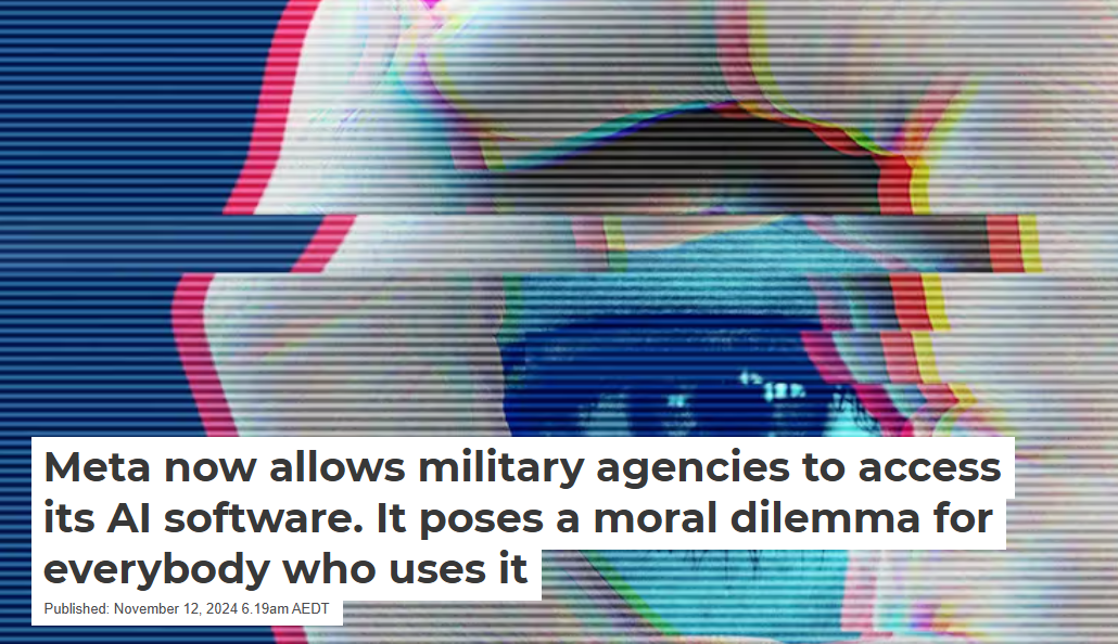 An article I wrote for the Conversation on Meta’s recent announcement around making their generative artificial intelligence (AI) models available to defence and national security organisations.